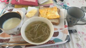ご飯がなかったのでパンで代用したけれど、味噌汁は必ず。